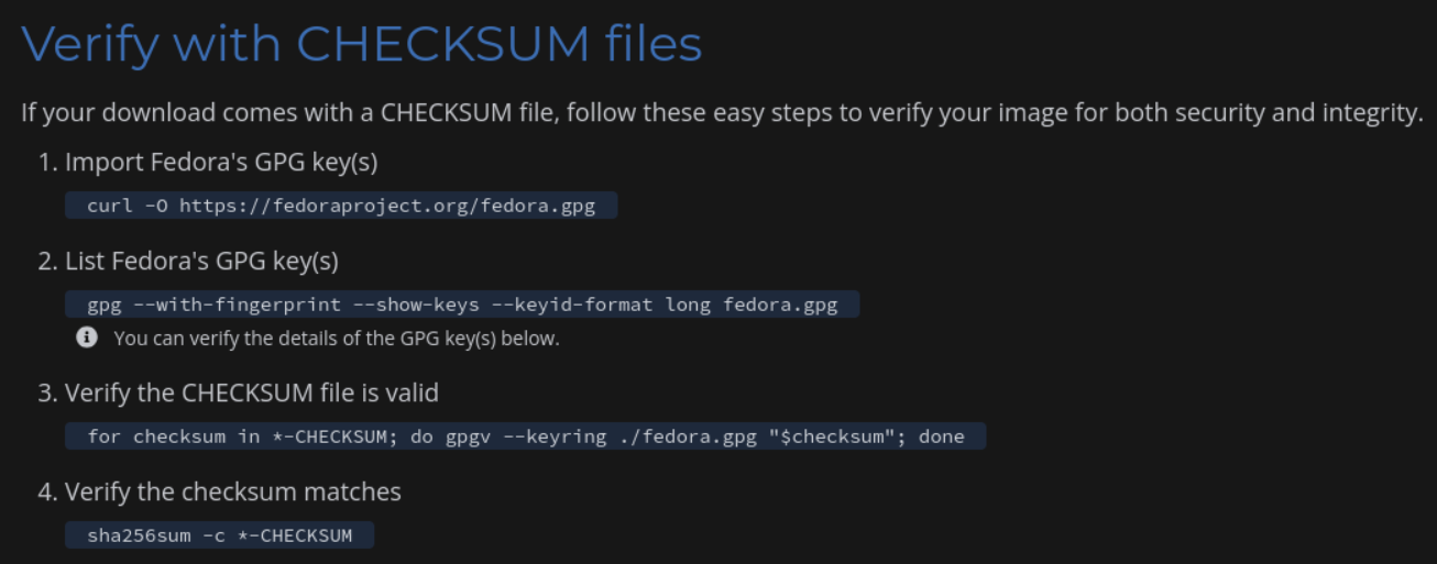 Left: Alice sending an email to Bob with her publickey and signature. Right: Instructions to verify Fedora ISO